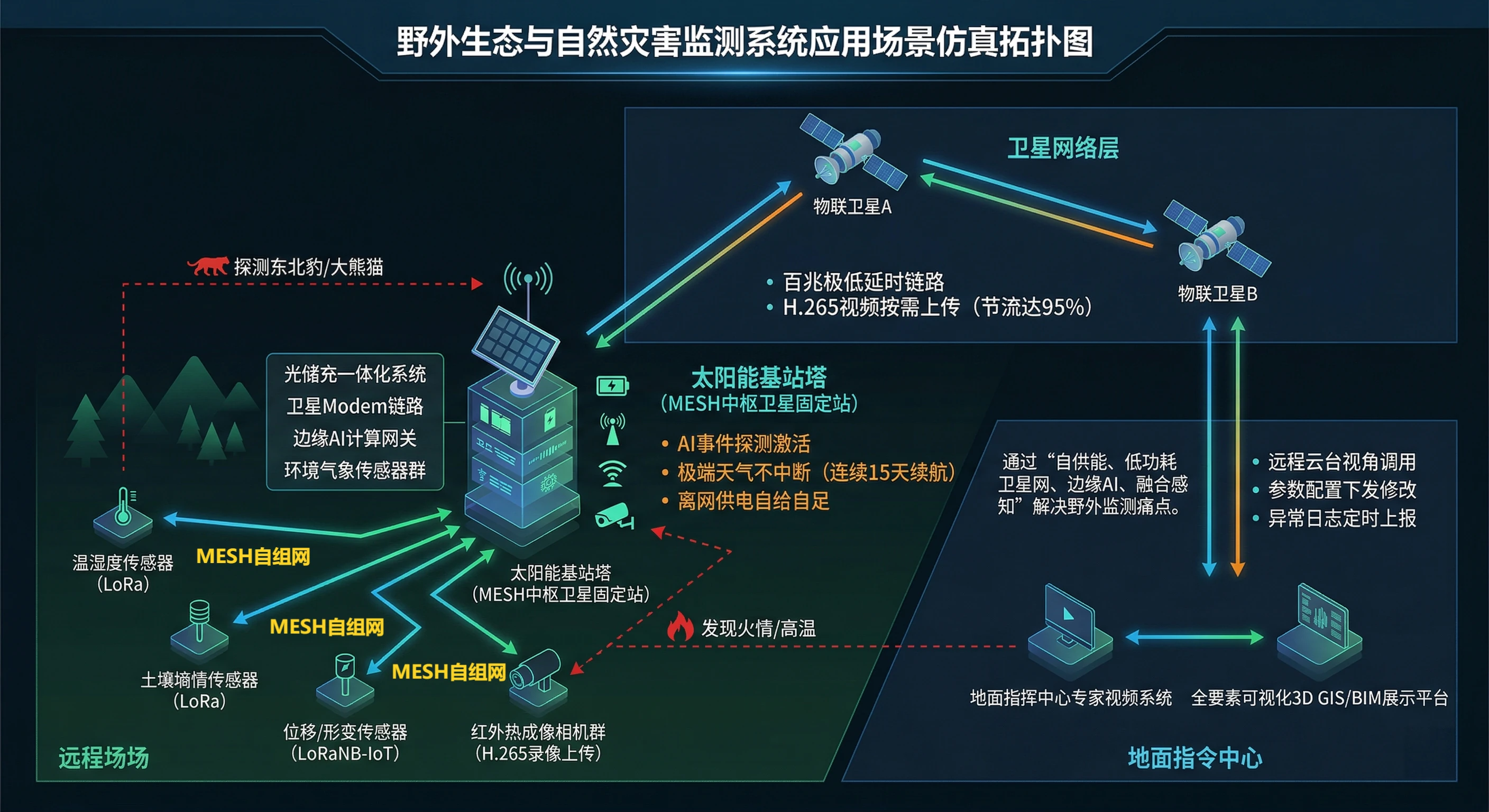 无中心化接力: 在岸线复杂的河道或岛屿间部署多个MESH节点(集成在太阳能监控杆上)。节点间自动寻找最佳路径,将数公里外的视频、热成像数据通过“跳变”方式汇聚到核心卫星站。