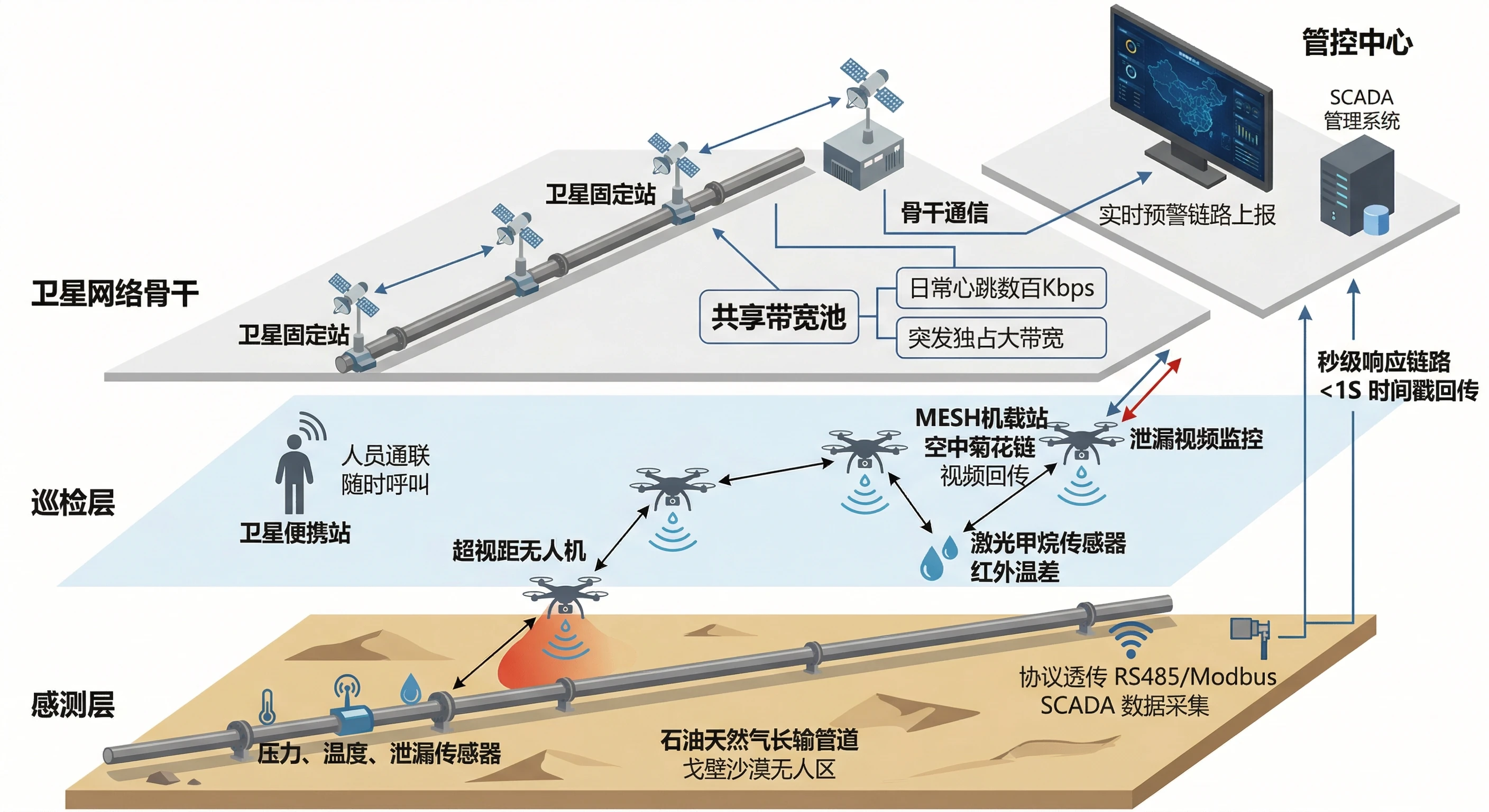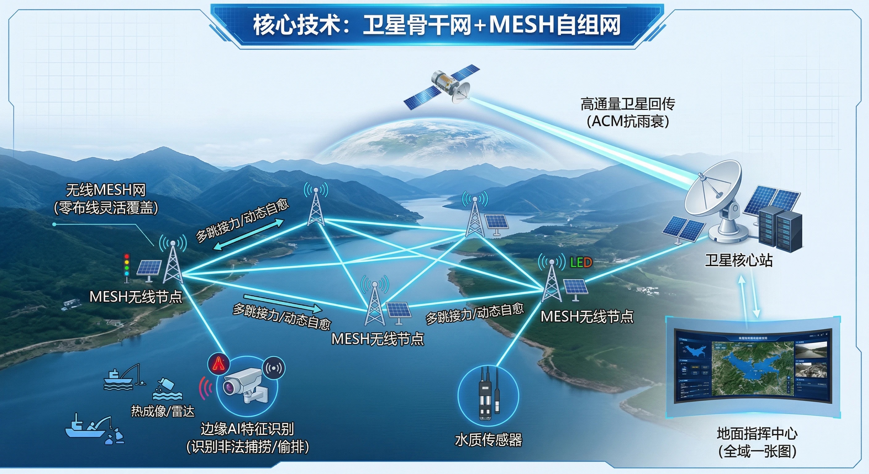 | 卫星骨干链路 | Ka/Ku高通量卫星 + ACM技术。作为流域总控中心与前端汇聚点的唯一高速通道。 | 彻底解决偏远水域“零信号”导致的数据回传断点问题。 |