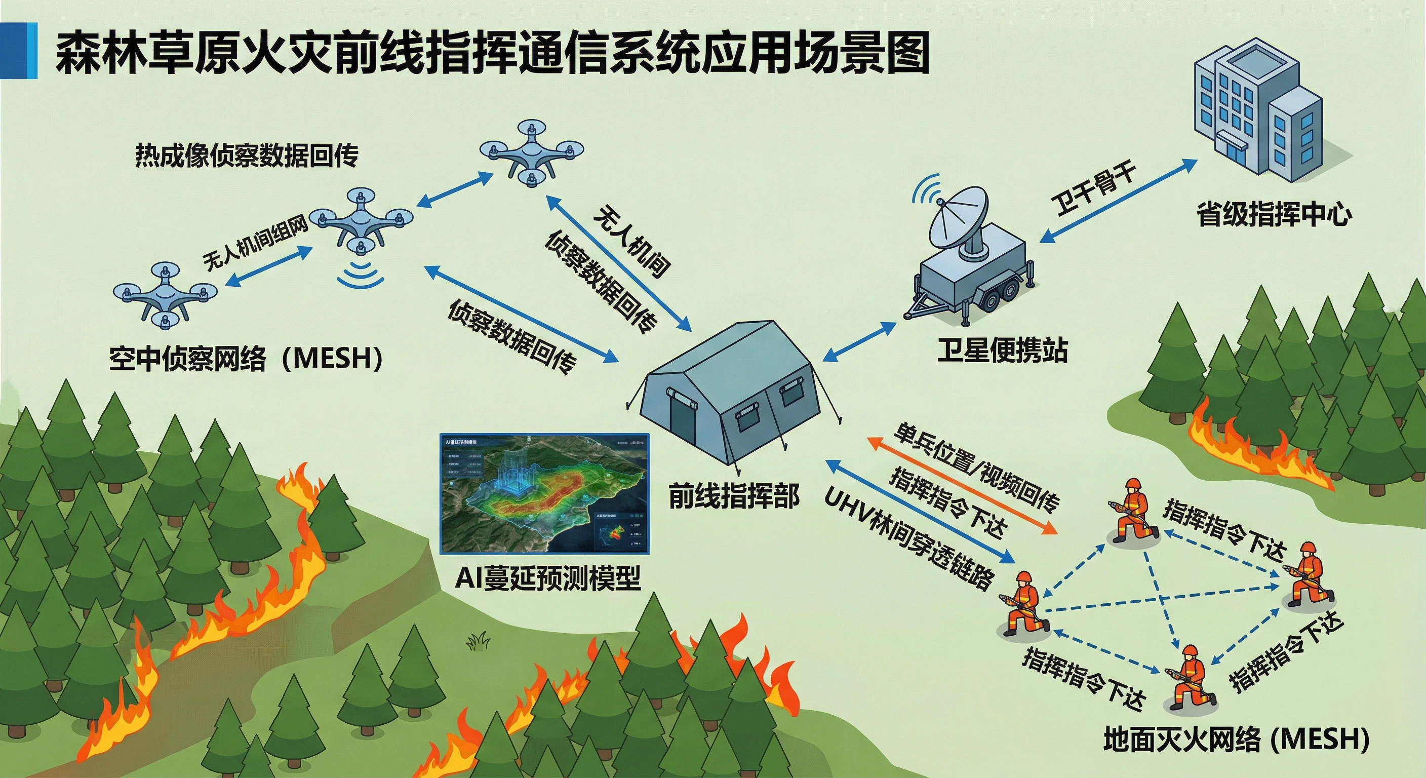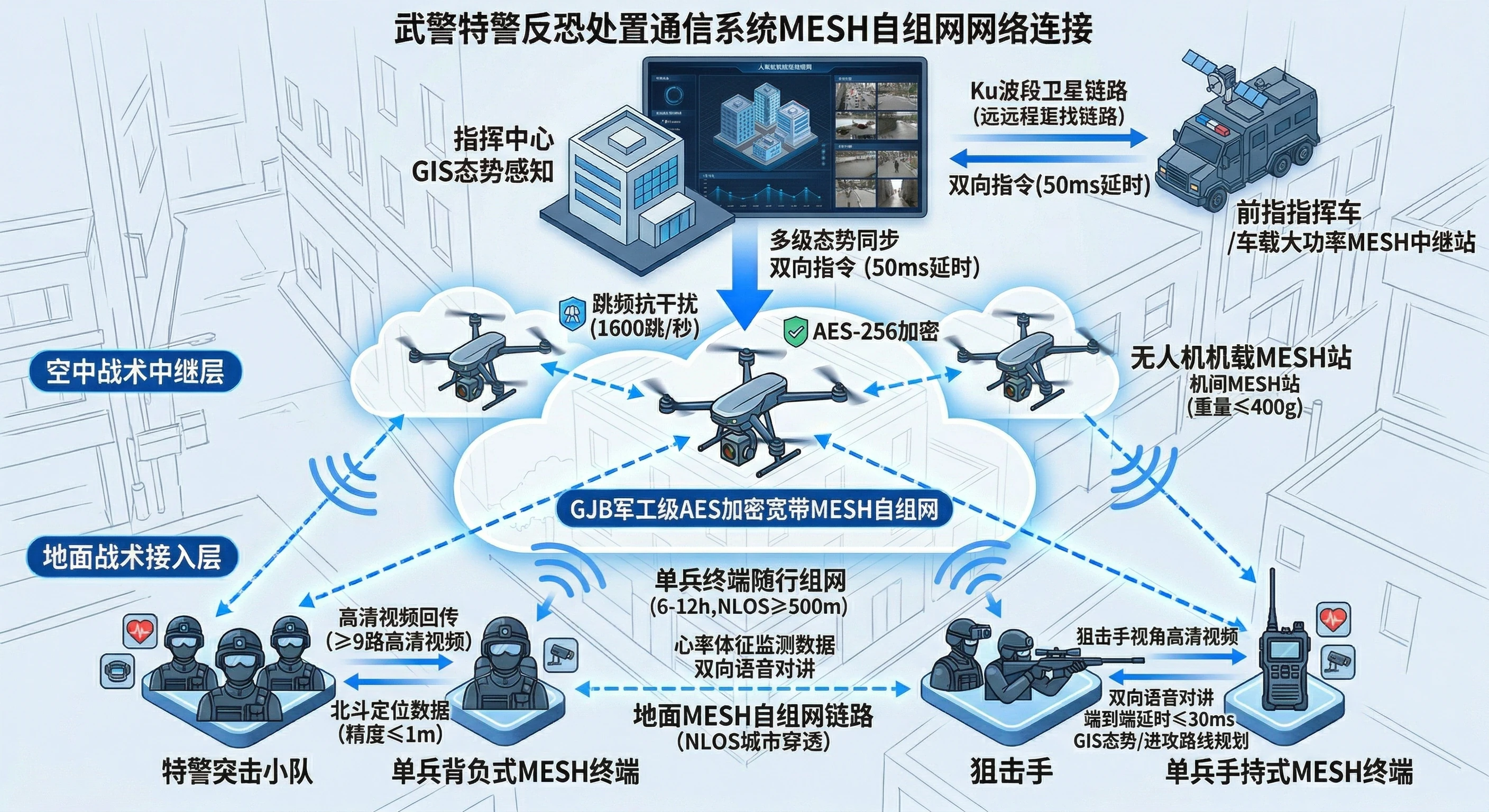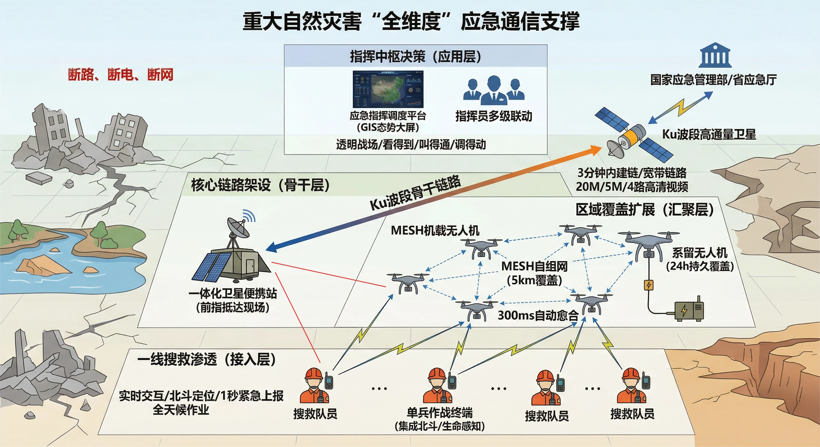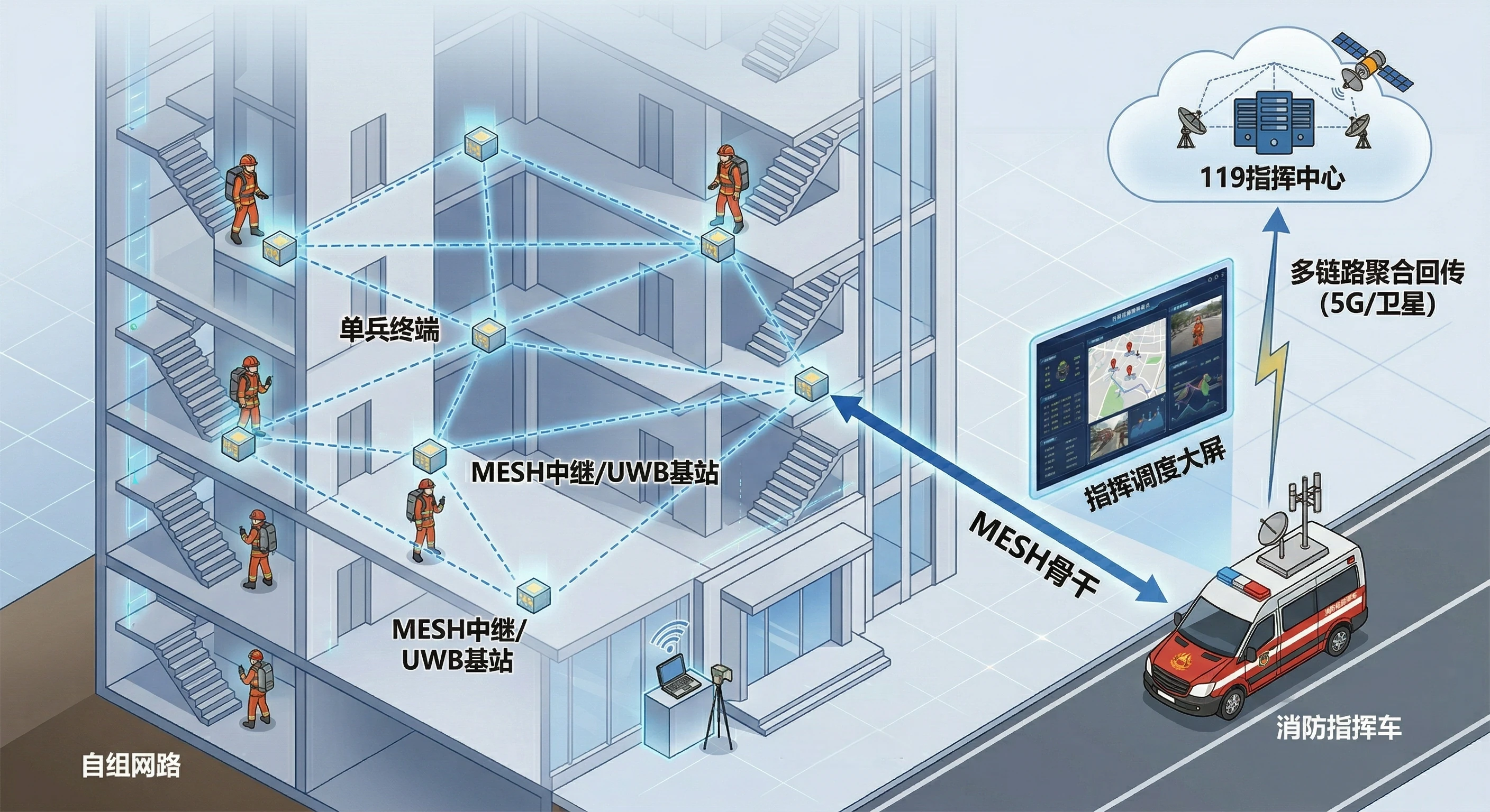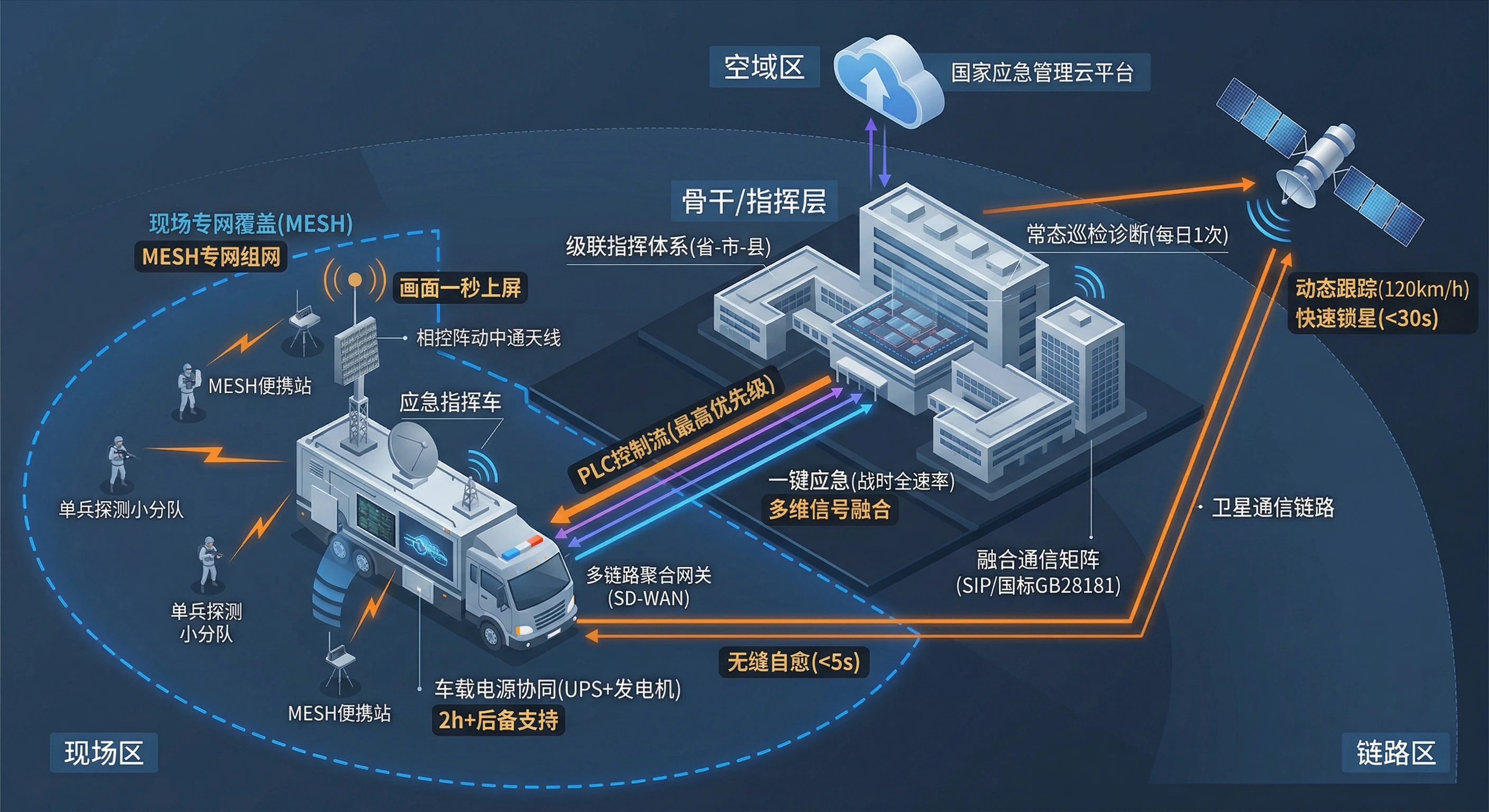 - 集群调度: 指挥车充当“通信网关”,将卫星链路、直升机UHF航频、车队VHF对讲及单兵MESH设备接入统一的语音指挥频道,确保空、地、人三方无缝协同。