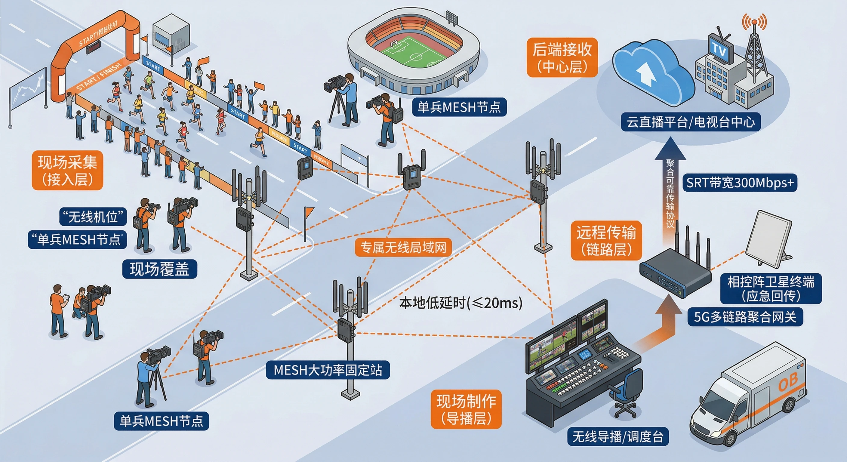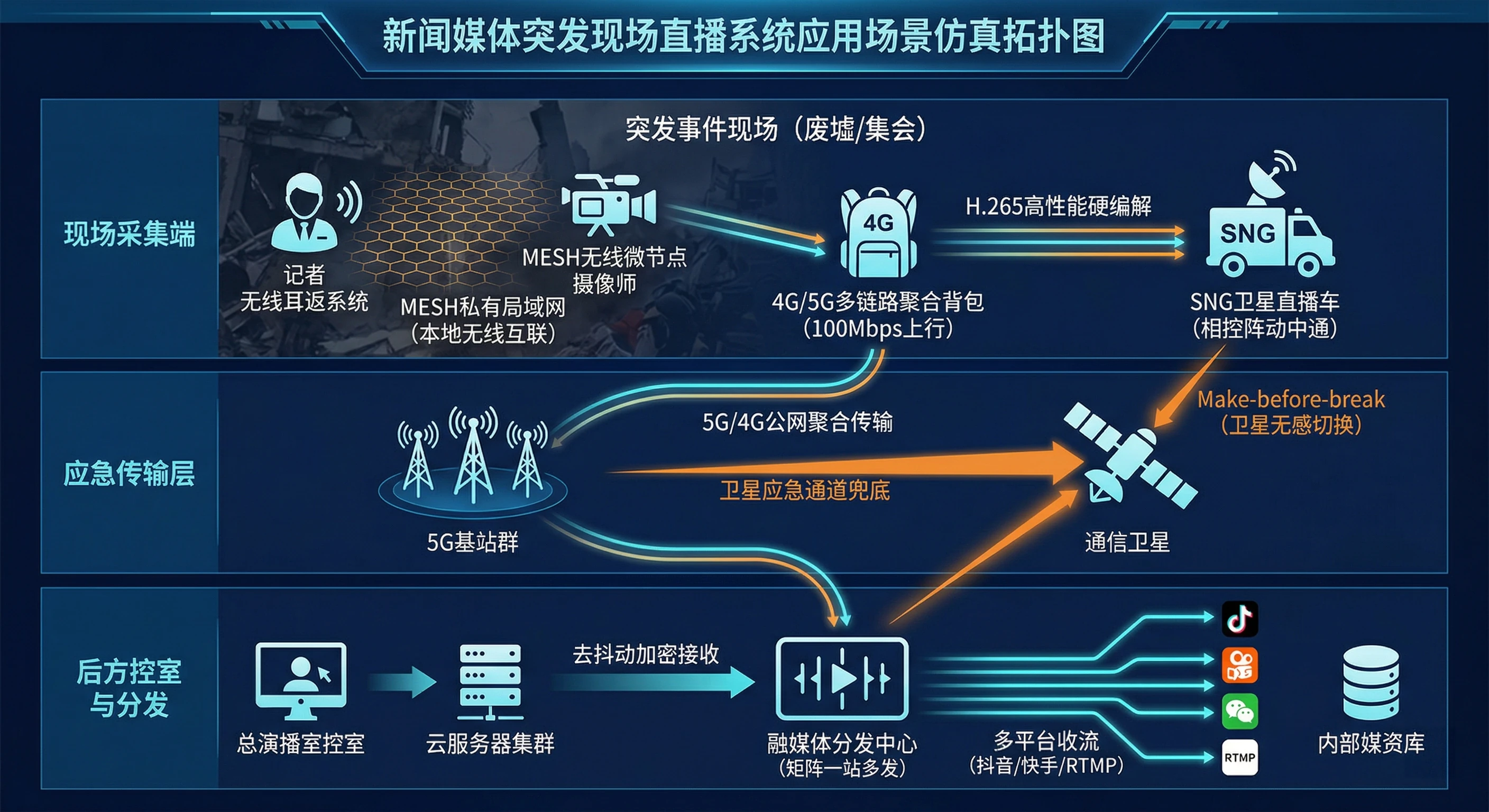 在突发新闻直播中,记者往往面临极度复杂的环境:从洪水肆虐的废墟到信号拥塞的密集人群。本方案通过构建一套 “单兵聚合背包 + MESH私有网 + SNG卫星链路” 的三级冗余架构,确保采访团队能够化身移动直播台,在任何极端环境下都能将4K高清画面即时、稳定地传回演播室。