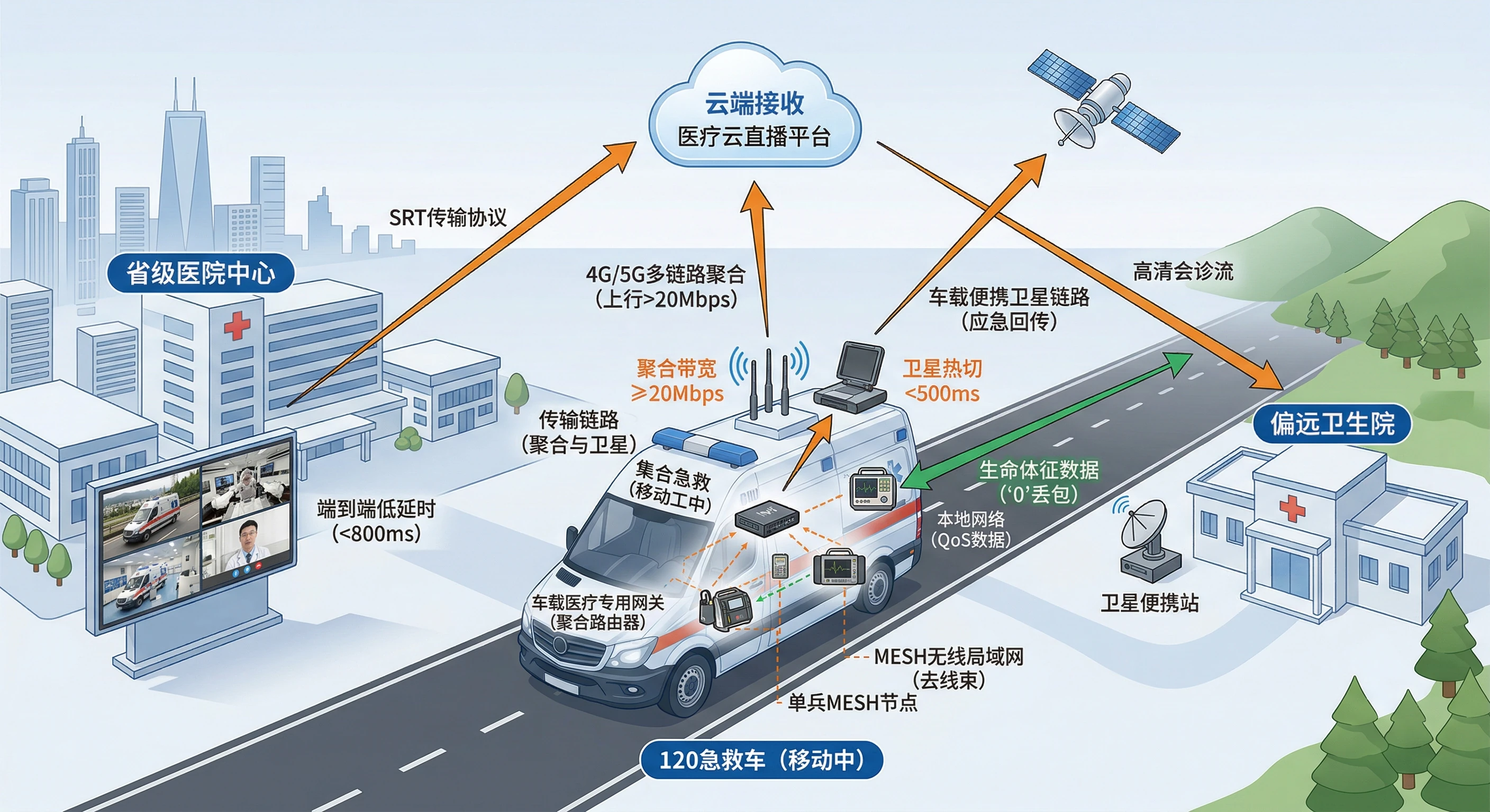 该系统构建了一个从“单兵”到“集群”再到“卫星”的全地形直播保障体系:
