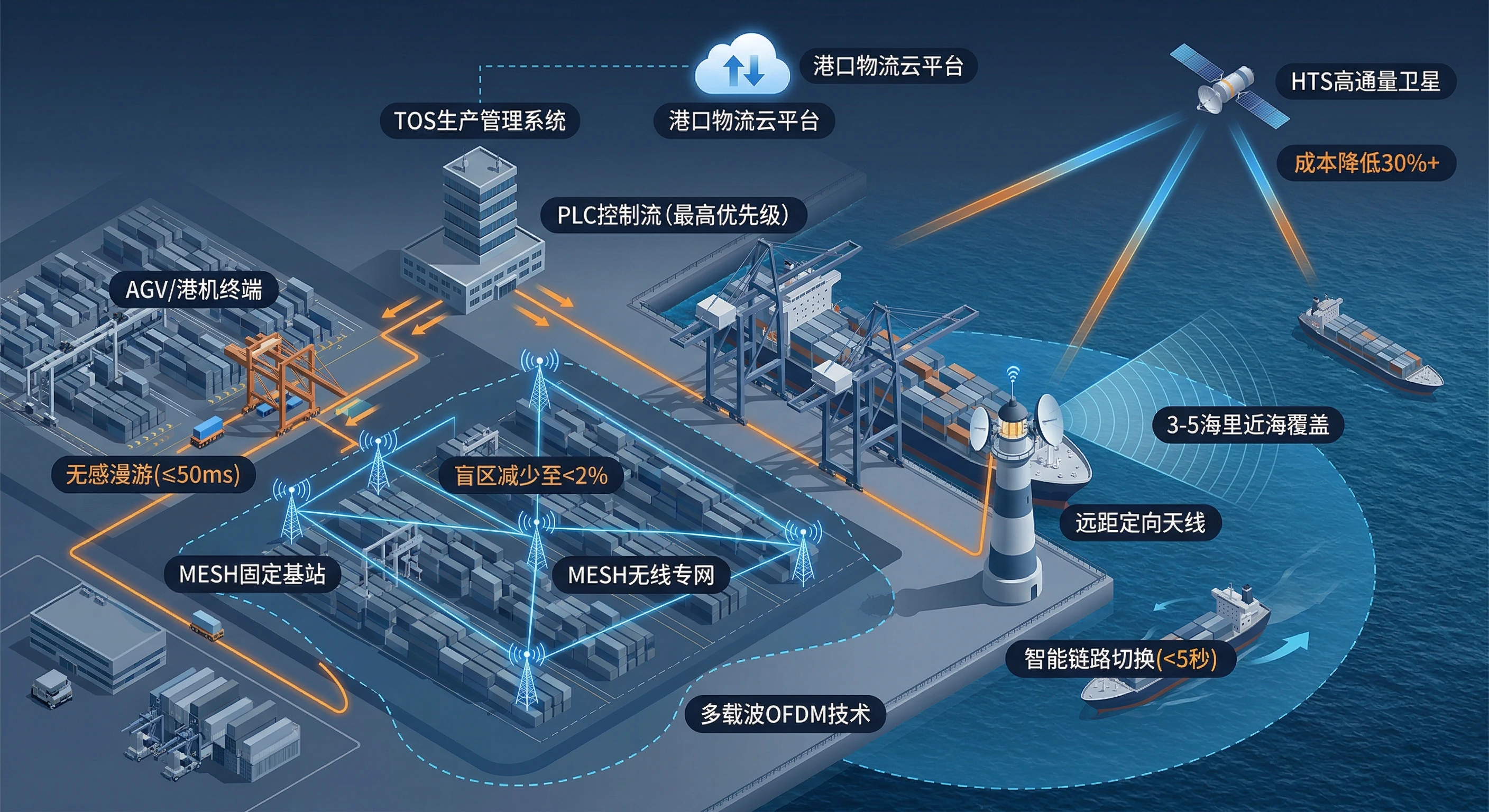 针对港口远端锚地公网覆盖不足的痛点,系统构建了高可靠的通信底座。