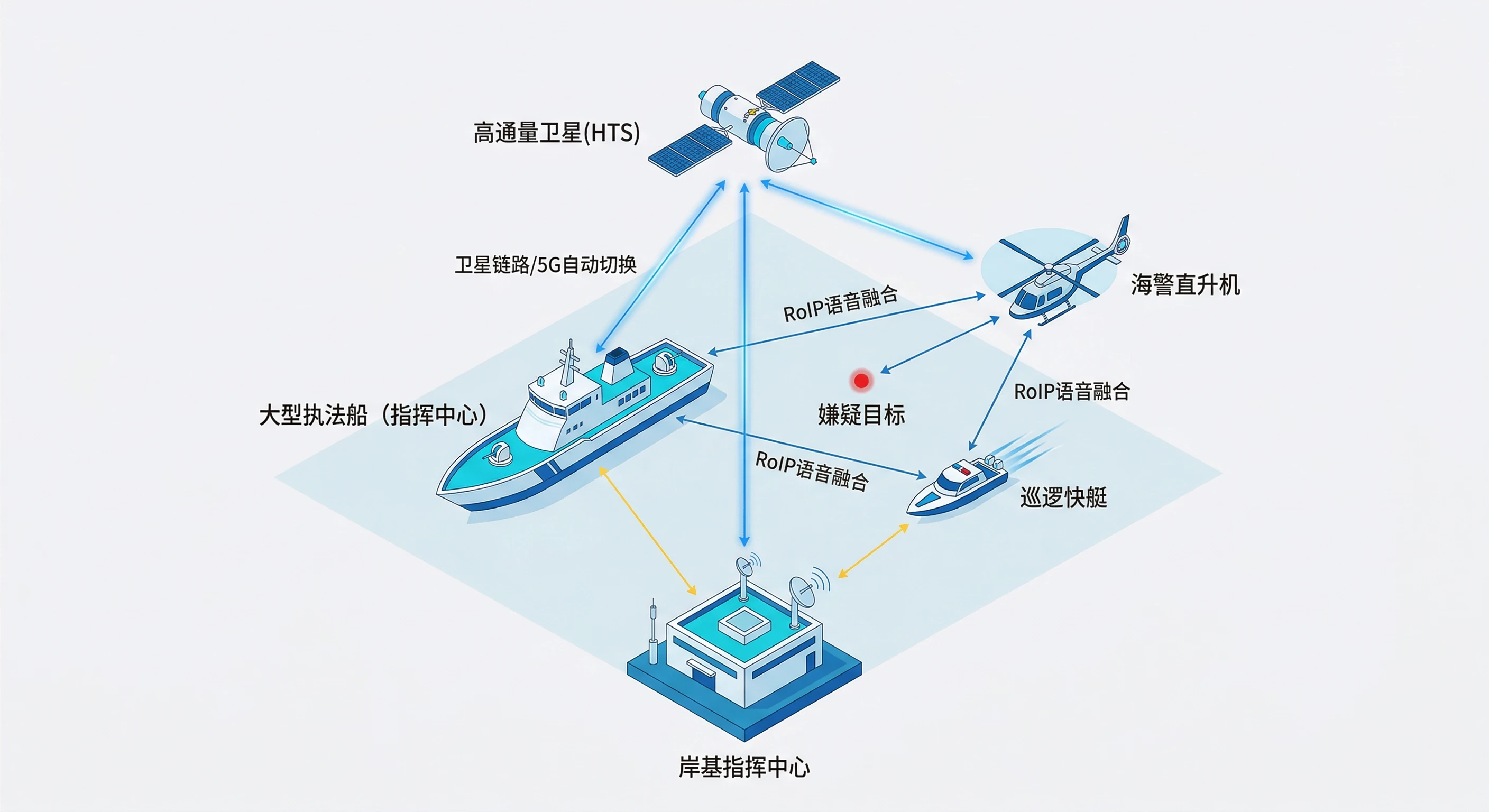 在远洋运输、科学考察或海上编队作业中,维持船队间及与岸基的持续、稳定、高带宽通信是确保作业安全的核心。本方案通过“5G+卫星+MESH”三网融合架构,配合船端边缘AI计算,构建起一套具备高度容错能力、低带宽依赖和主动安全预警功能的立体化通信与监管体系。