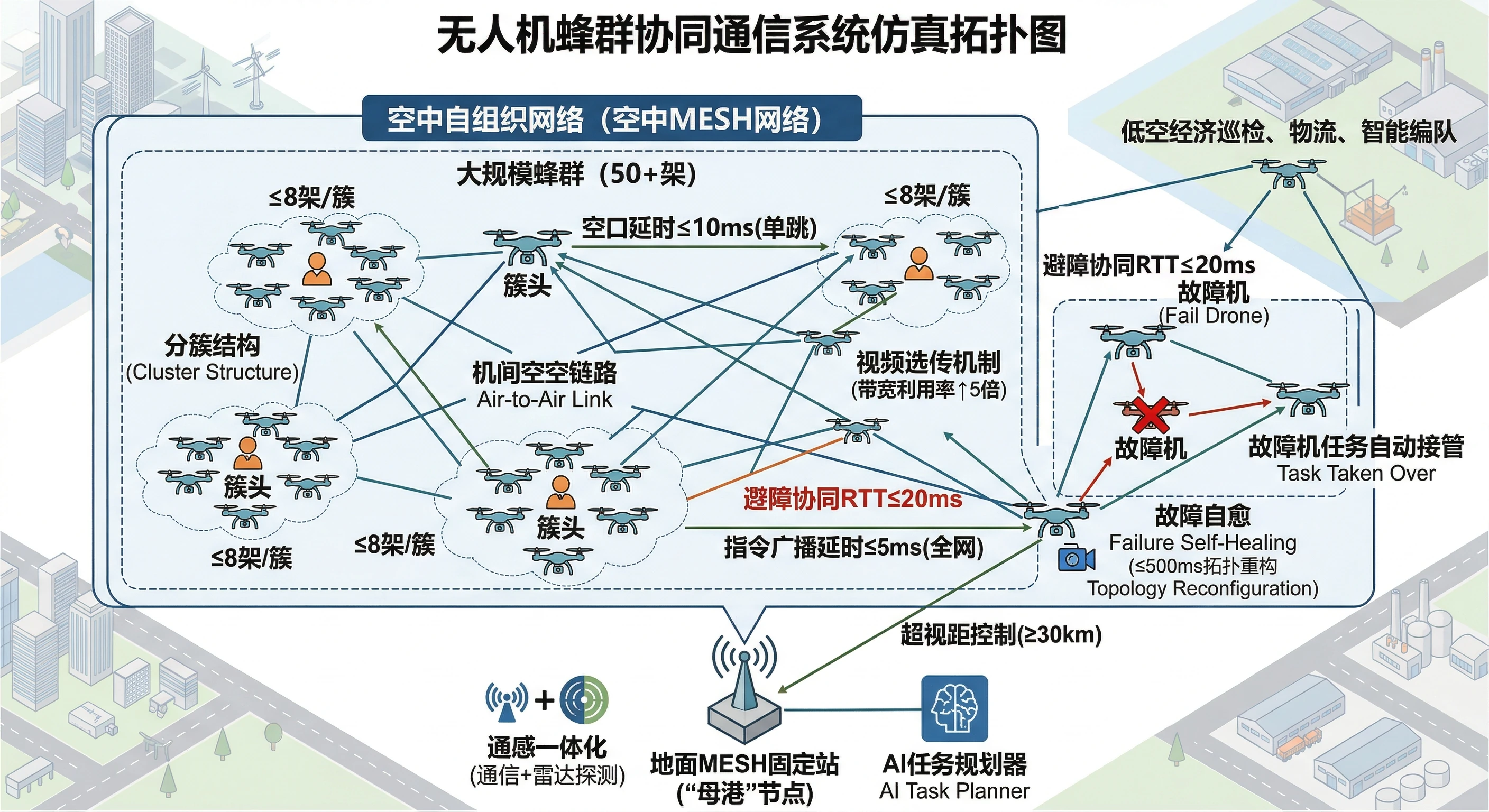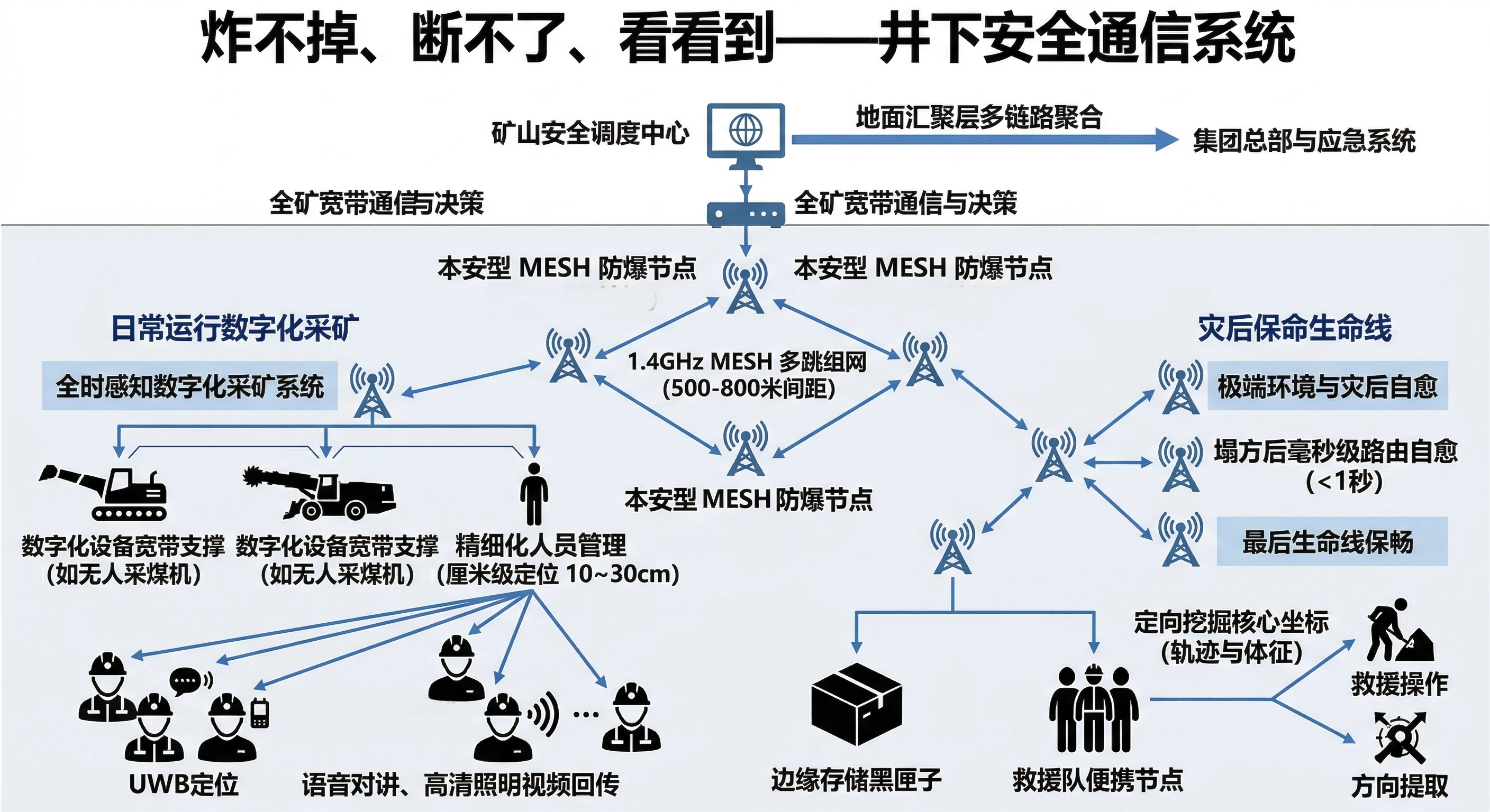 通过 “垂直跳跃+水平链式” 解决空间阻隔导致的“联不上”问题; 通过 “UWB 定位+低延时图传” 解决安全管控中的“看不见”问题; 通过 “边缘调度+自组网韧性” 解决极端灾害下的“救不到”问题。