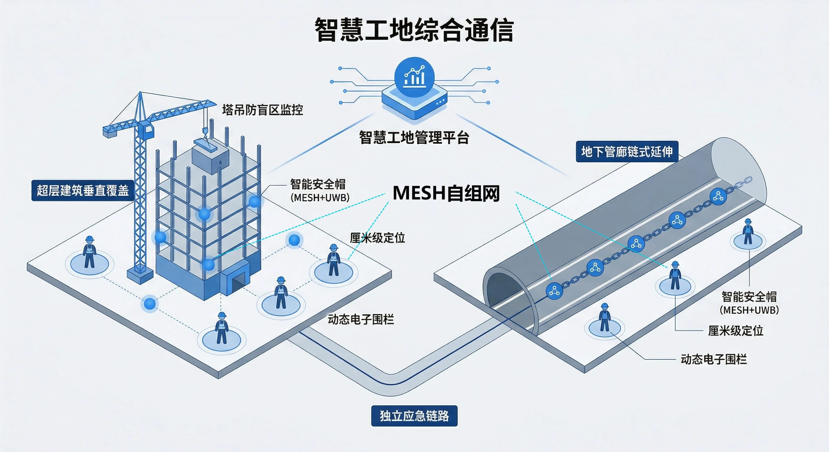 | 机械安全 | 塔吊吊装视距盲区风险高 | MESH 定向传输 + 低延时吊钩监控 |