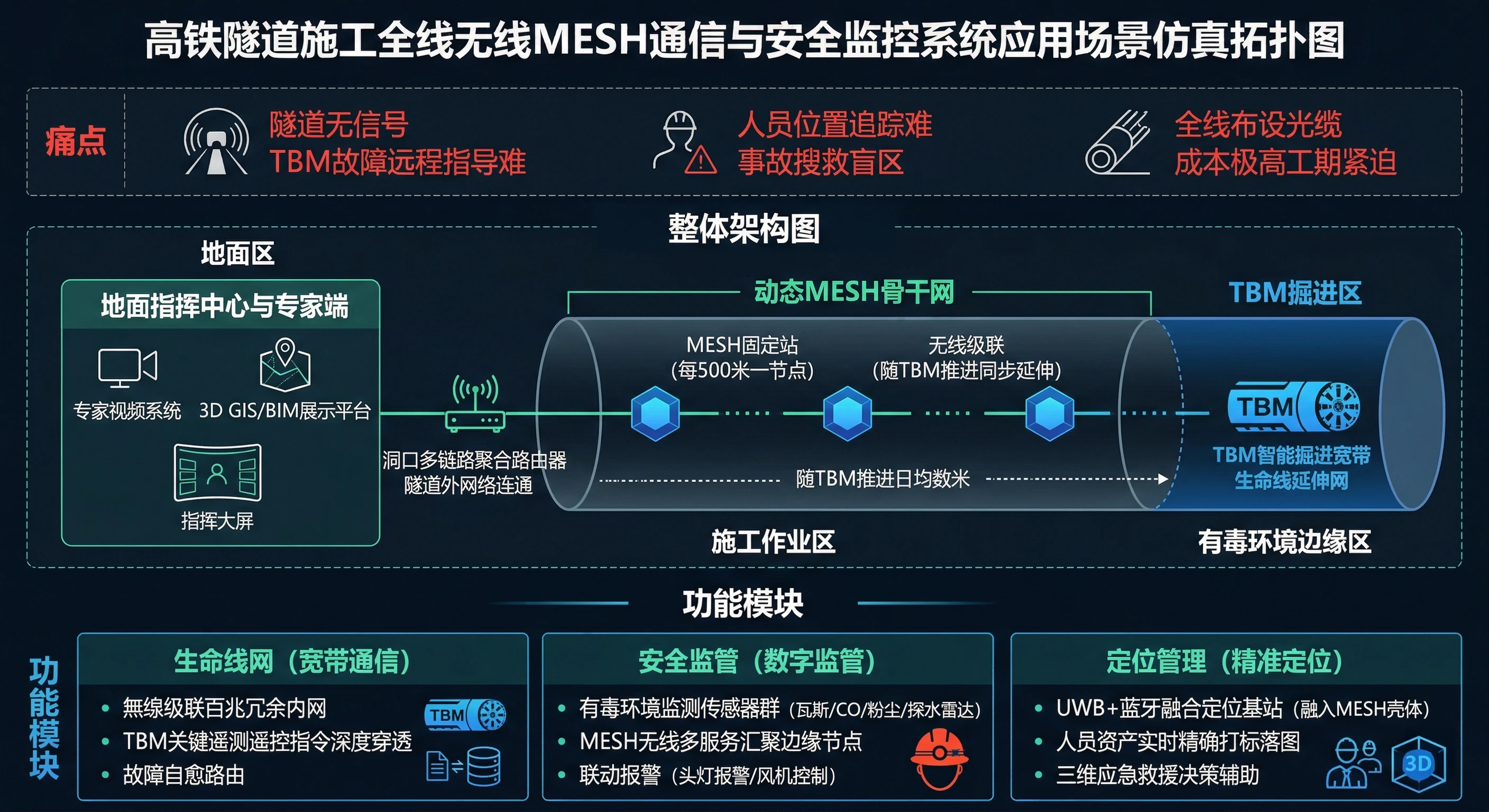 为高铁隧道掘进施工全线提供覆盖的宽带通信,保障施工安全监控、人员定位及TBM远程技术支持。