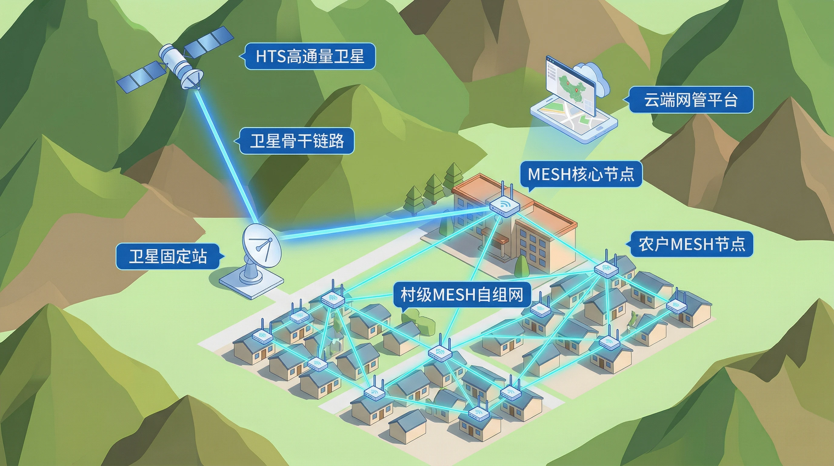 在大型水库、跨省流域或偏远江段,光纤布线由于淹没区动态变化和地理阻隔几乎无法实现。本方案通过 “卫星作为骨干,MESH作为毛细血管” 的混网模式,彻底打通了数据回传的“最后一公里”。