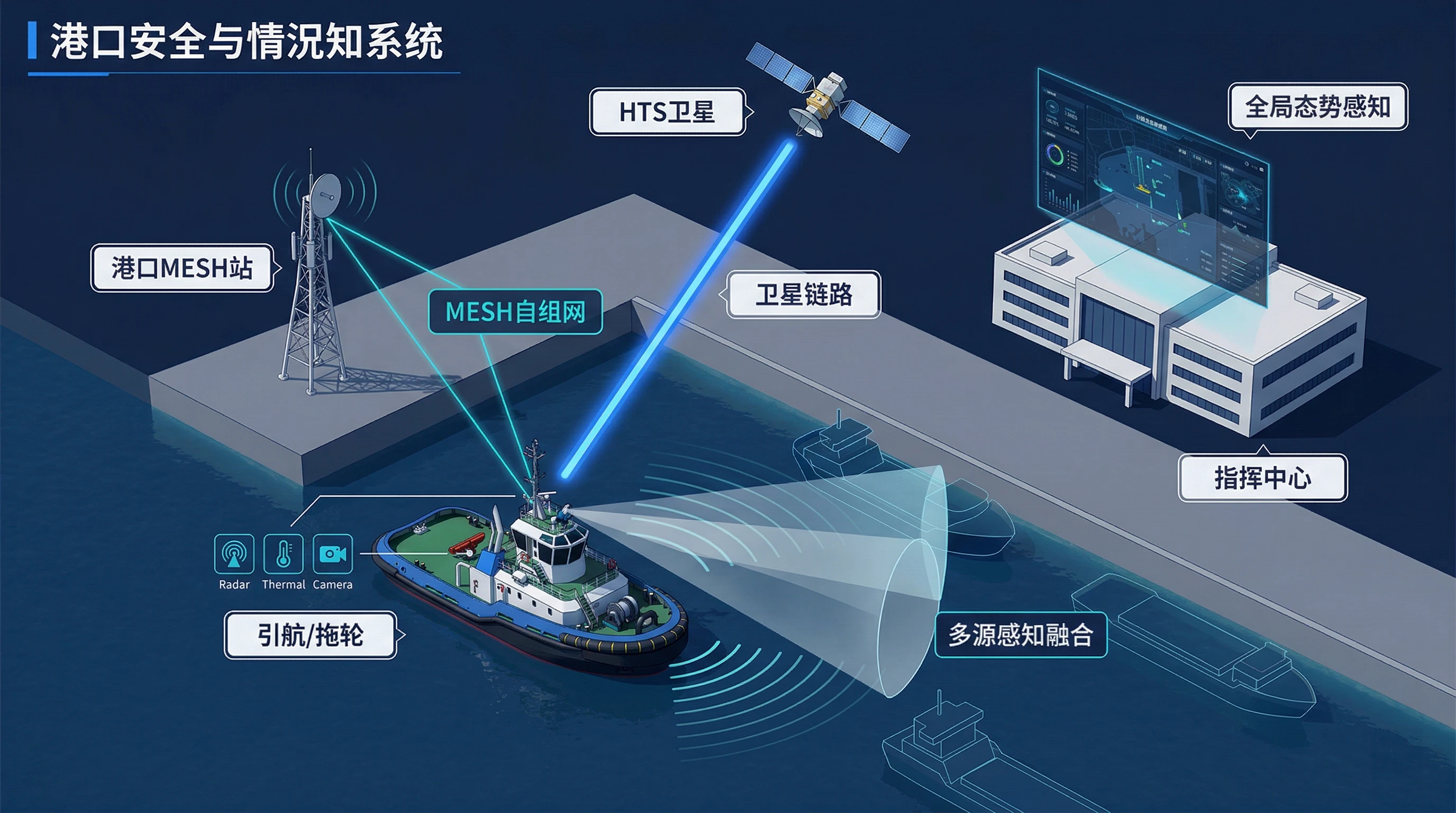 在大型港口的锚地、引航道及靠泊区,复杂的地理环境与多变的气象条件(如浓雾、暴雨、黑夜)给船舶作业带来了极大的安全隐患。本方案通过 “卫星+MESH”双模通信链路 为基础,融合 多源感知技术(雷达/热成像/AIS) ,构建起一套从引航快艇到指挥中心的实时化、智能化安全监管体系。