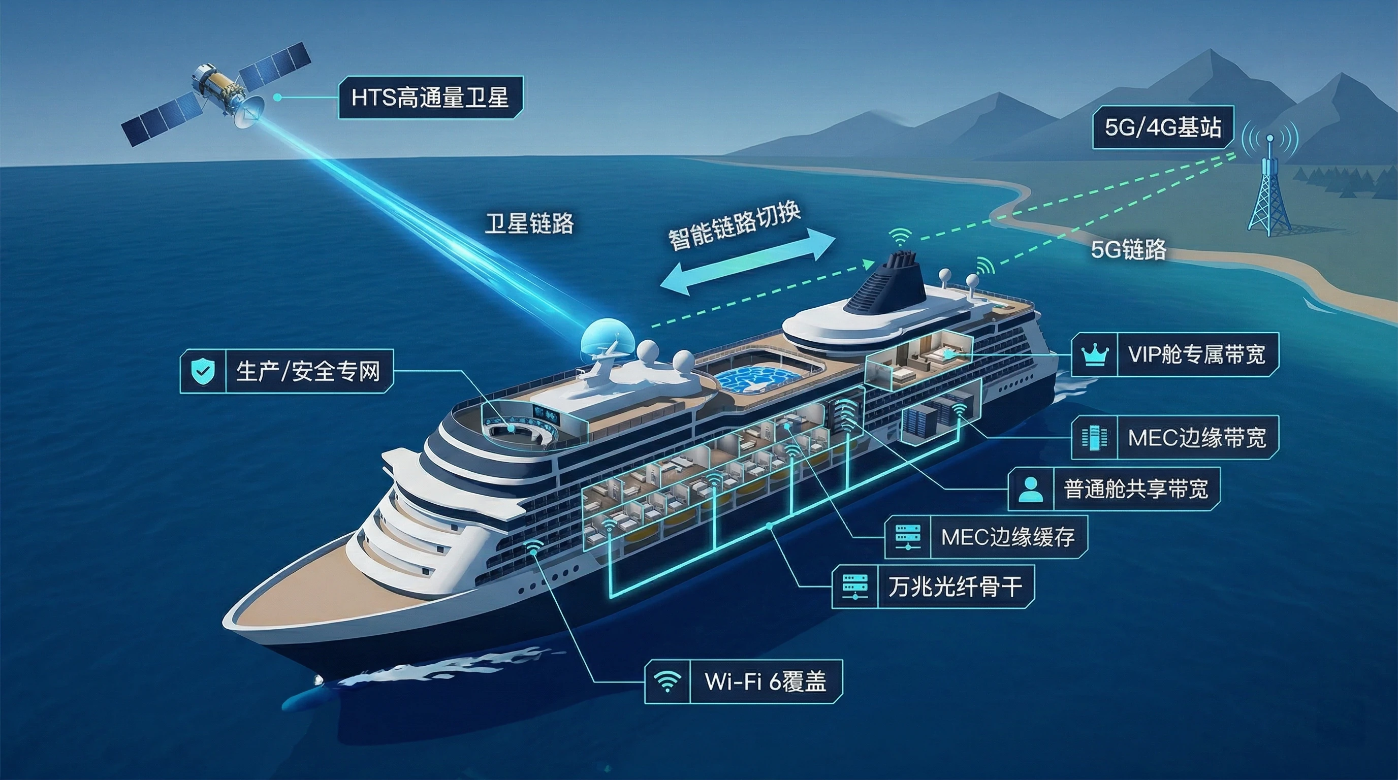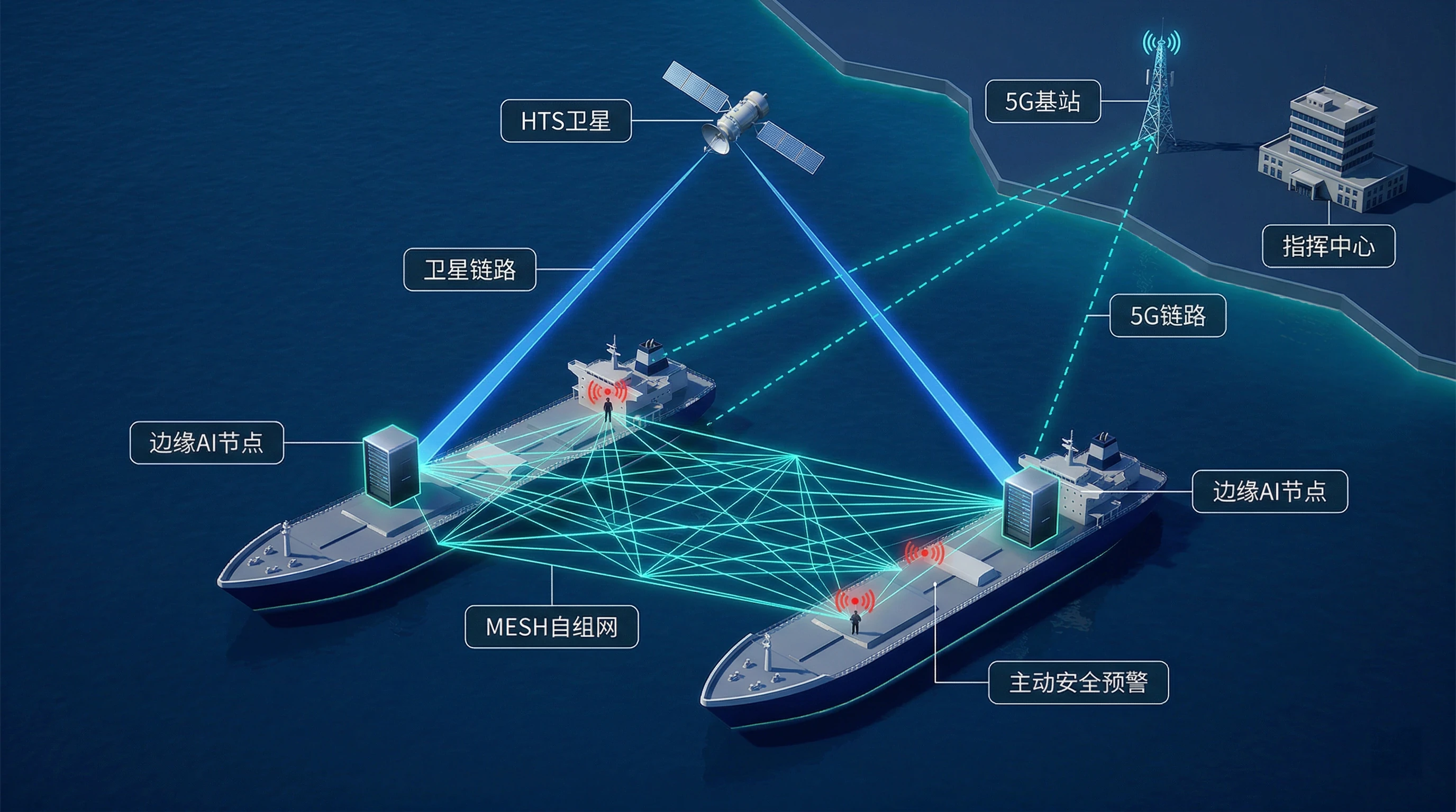 为船队构建"近海5G、远海卫星"智能切换融合网络,多船MESH互为热备,实现AI主动安全预警。