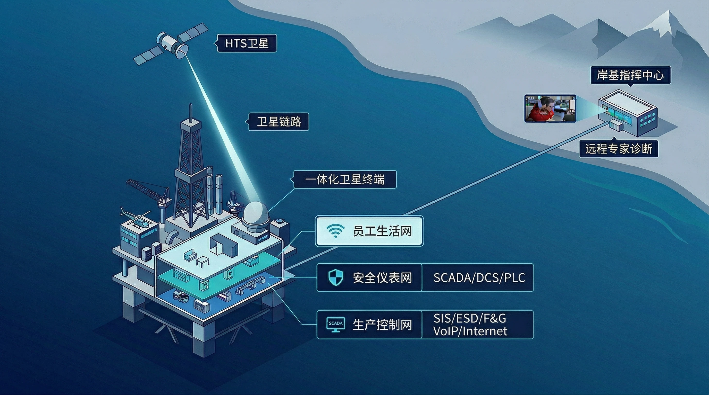 在距离陆地超过 200 海里的深海区域,油气钻采平台处于完全脱离地面网络覆盖的“信息孤岛”环境。该场景不仅要求通信系统具备极高的 抗损毁能力 与 生产连续性 ,还需满足石化行业严苛的 HSE(健康、安全、环境) 标准。本方案通过“双模双径卫星备份+三网物理隔离+边缘AI远程运维”的架构,构建了一个星地一体化的智能生产中枢。