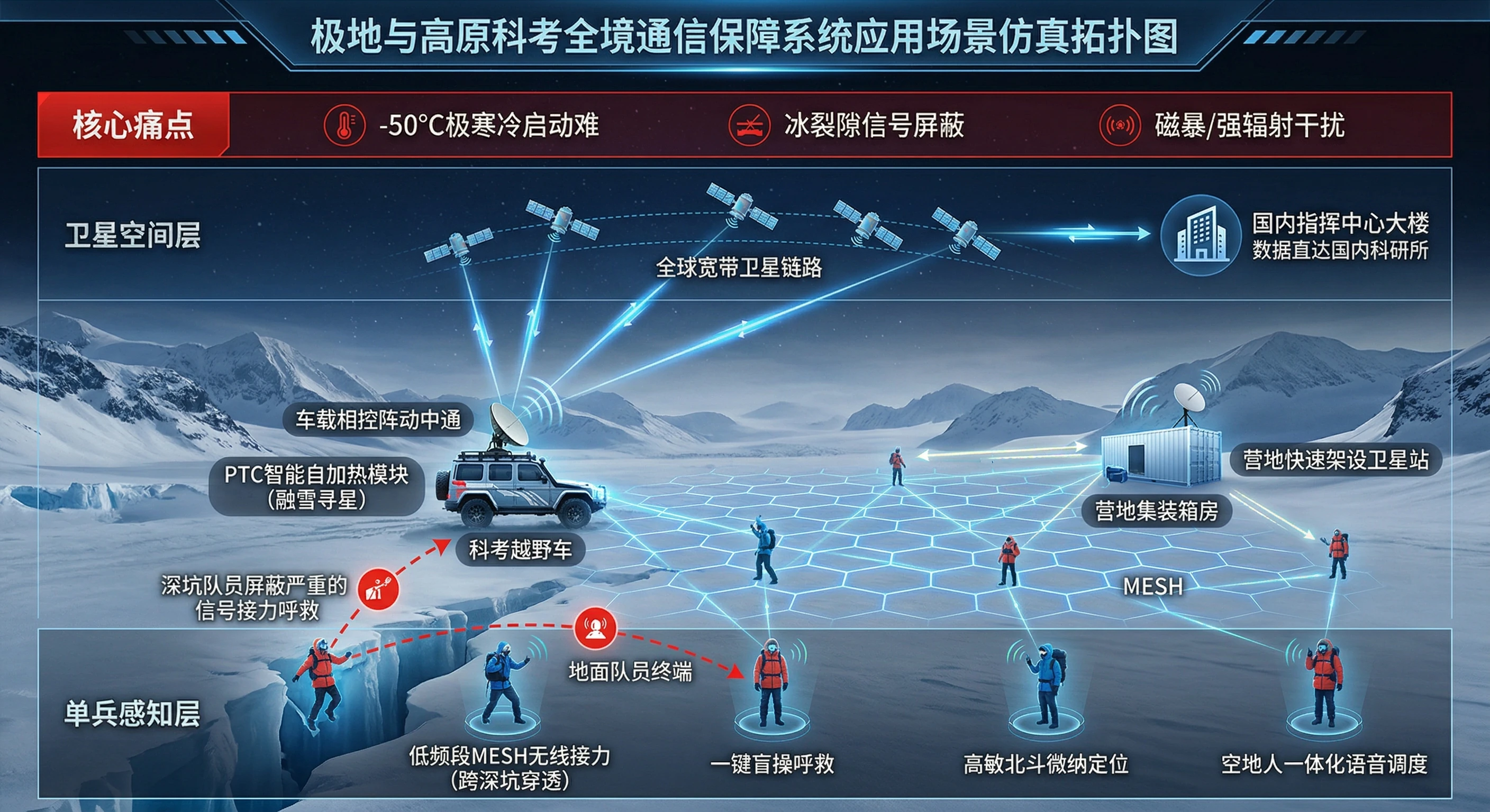 | 人员安全保障 | 低频MESH接力 + 北斗微纳定位 | 解决冰裂隙等极端地形下的求援难题,定位精度高。 |